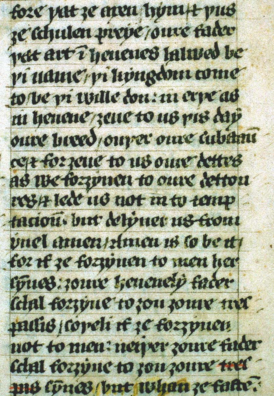 "Oure fadir that art in heuenes, halewid be thi name; thi kyndoom come to; be thi wille don in erthe as in heuene: gyue to us this dai oure breed ouer othir substaunce; and forgyue to us oure dettis, as we forgyuen to oure gettouris; and lede us not in to temptacioun, but delyuere us fro yuel."