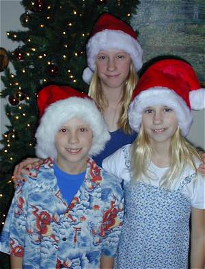 ornaments on the tree and wearing their Santa hats.