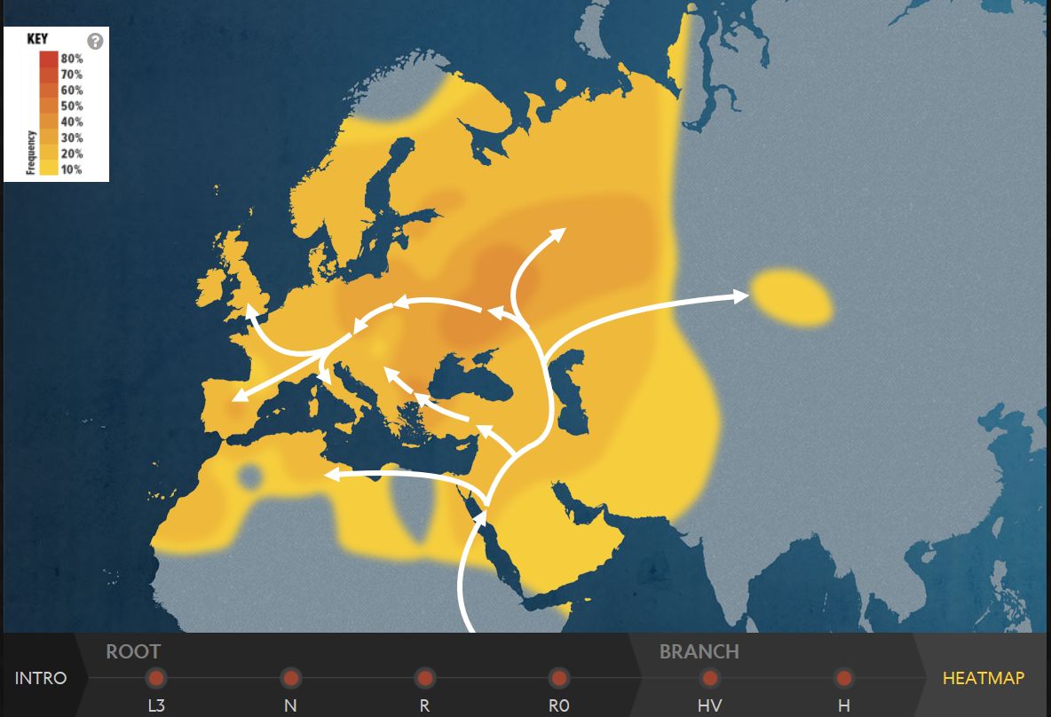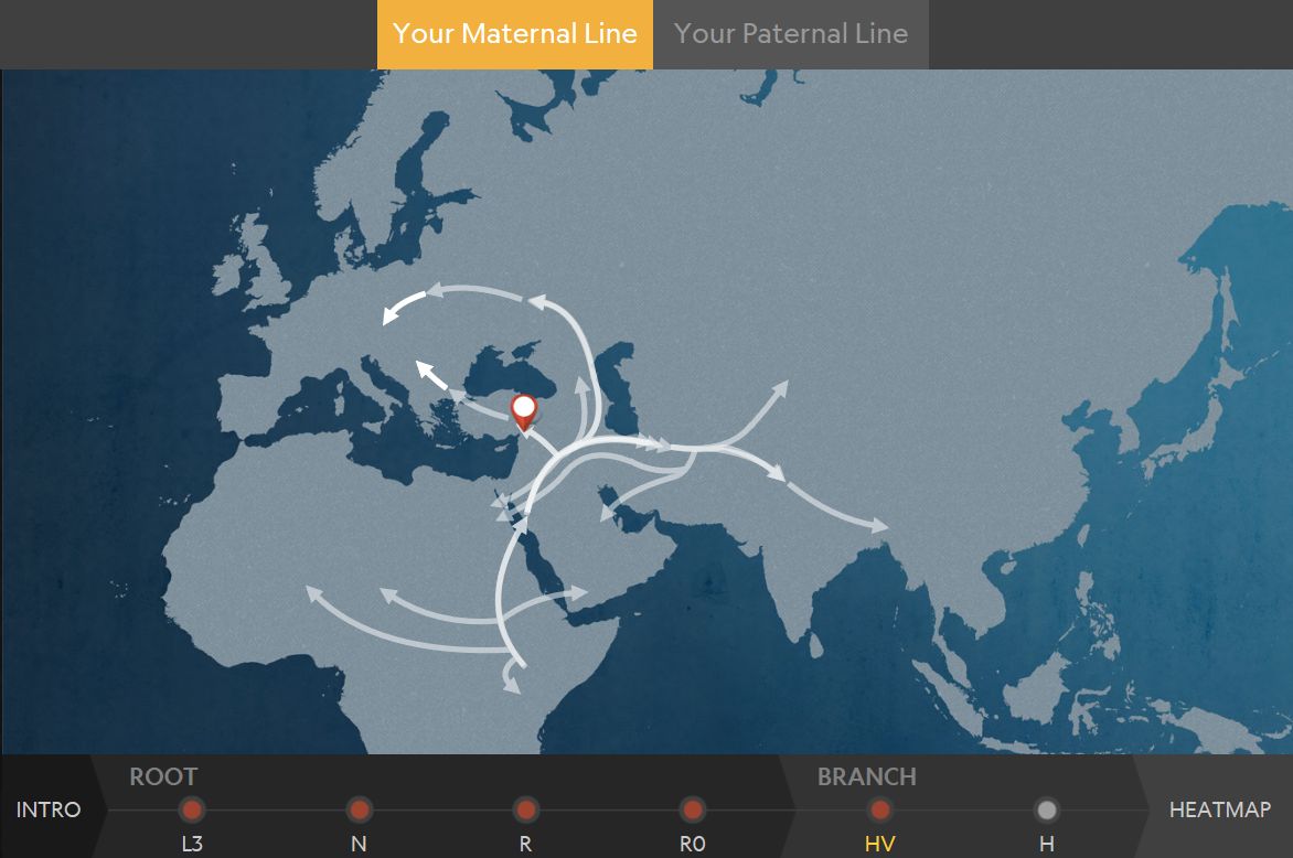 While some descendants of these ancestral lineages moved out across Central Asia, the Indus Valley, and even back into Africa, your ancestors remained in the Near East. Descending from haplogroup pre-HV, they formed a new group, characterized by a unique set of mutations, called haplogroup HV.