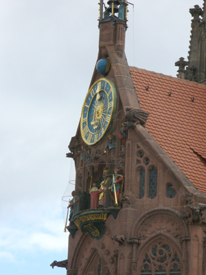 In the Old Town market square we were able to see the "Männleinlaufen," an old clock with mechanical figures (the seven Electors pacing round the Emperor Charles IV) in the Gothic Frauenkirche (Church of Our Lady, 1352-61.)
