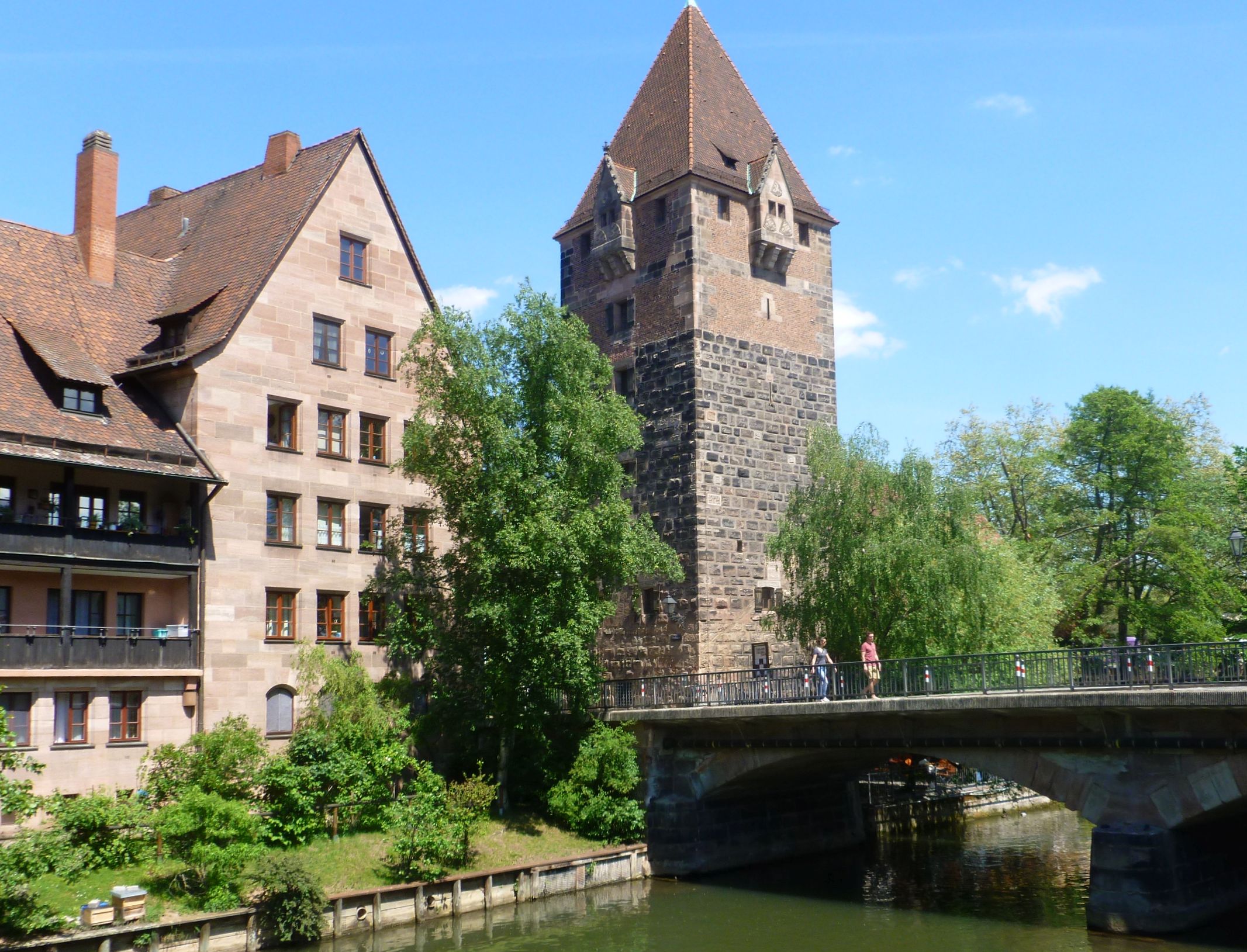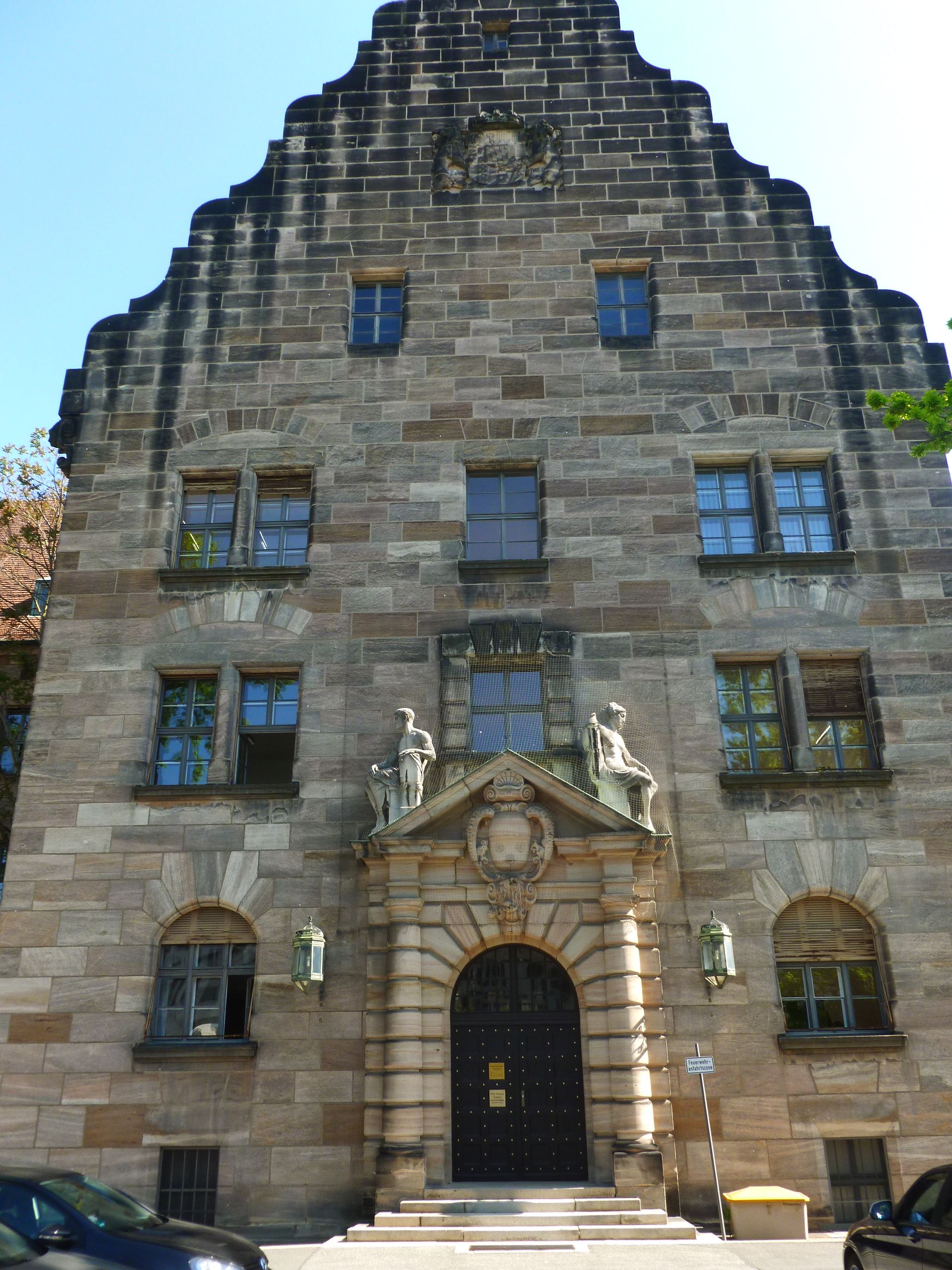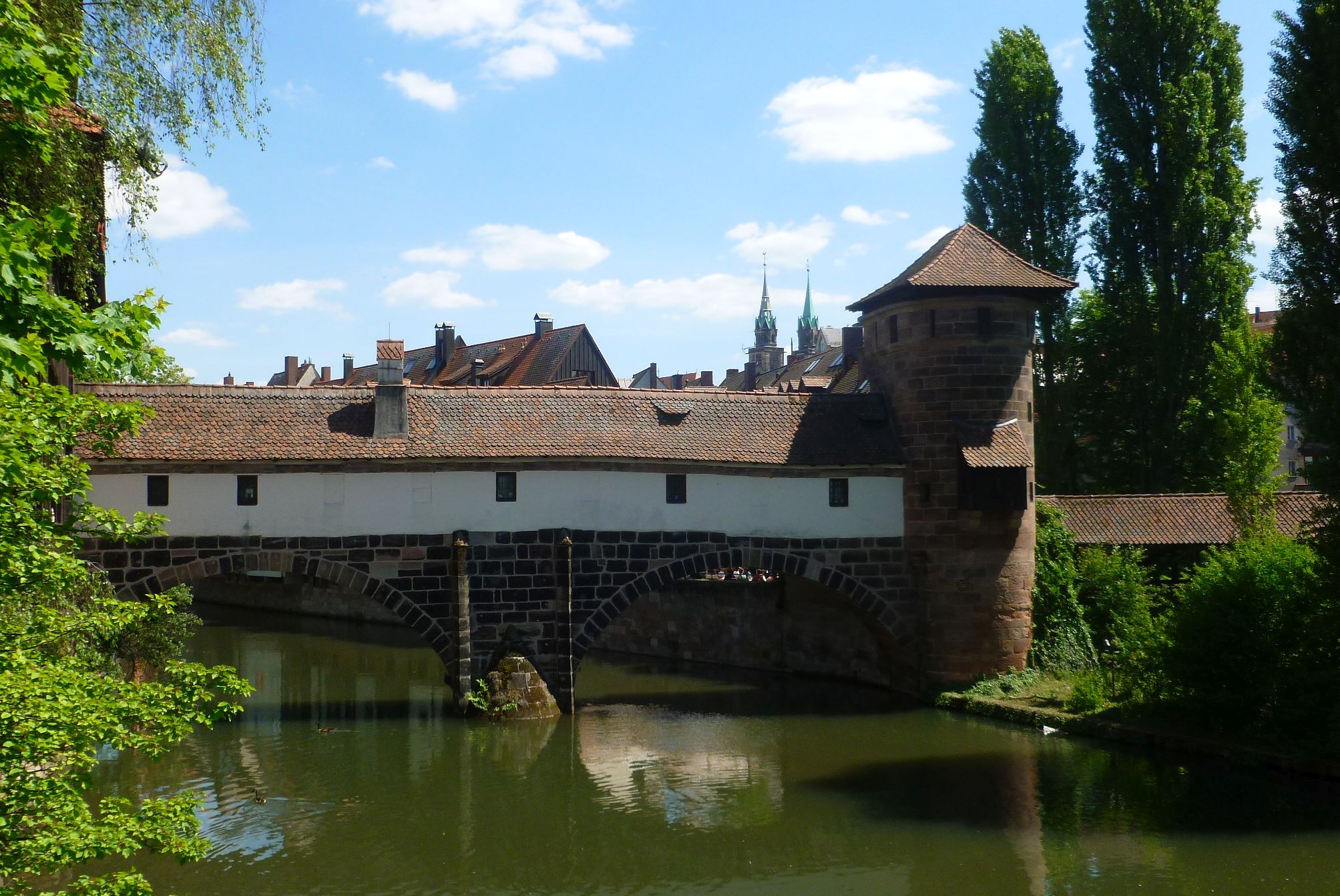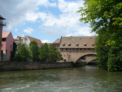 The Wine Store (Weinstadel) is one of Nuremberg's most beautiful buildings. Two half-timbered stories rise above the ground floor fashioned from sandstone ashlars. The front towards the river Pegnitz boasts wooden galleries with metal gargoyles, and there is a bridge with a covered walkway towards the Hangman's Bridge. During the 13th century, this was the course of the "last-but-one city fortification", which connected the two parts of the town by bridging the river Pegnitz.