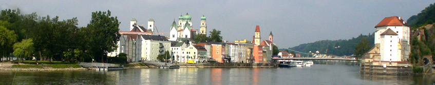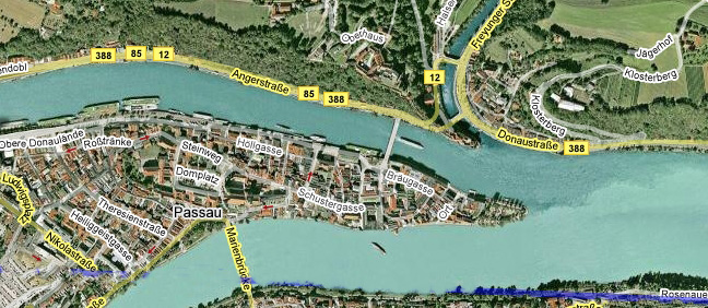 The city of Passau lies at the confluence of the Danube, Inn and Ils rivers. The Ils is the small river coming in from the top, the Danube is in the center and the Inn comes in at the bottom of this map. Note the differences in color at the confluence.