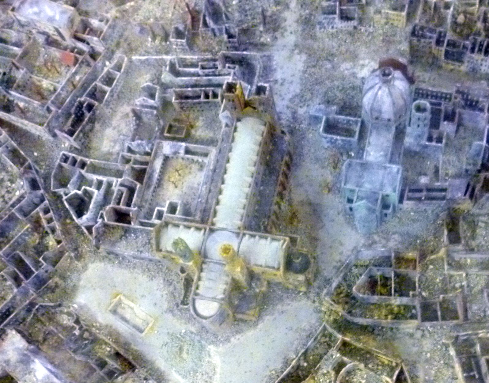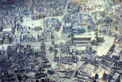 A model of the destruction after the 1945 bombing of Würzburg. Note the remains of the Dom at the right center and the Marienkapelle towards the top at the left of center.