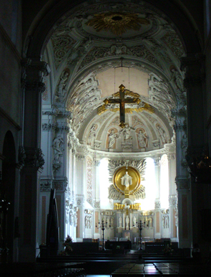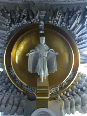 This photo demonstrates how the rear of the church is dark and the fromt is light, as described above. The nave is kept dark, representing the Dark Ages, and the progression is toward the light area above the altar, representing the Second Coming of Christ
