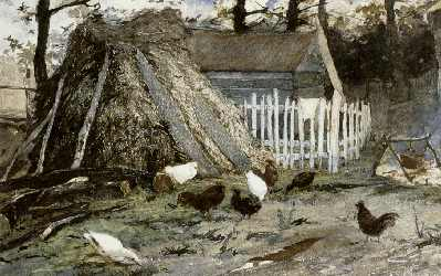 Willem Maris' Barn with Chickens in watercolor and gouache