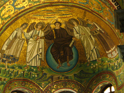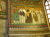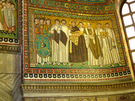 This is the court of Justinian, who is shown with both a halo and a crown. To the right are clergy, including Archbishop Maximanus, and monks. To the left are secular officials, including military officers who bear the Constantinian monogram, Chi Rho, on their shield.