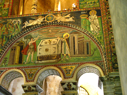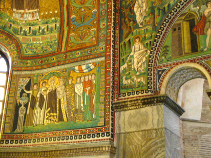 The court of Theodora, the wife of Justinian. Neither Justinian nor Theodora were actually present in Ravenna, but she is nevertheless represented as part of an imperial court group on the side of the apse opposite her husband