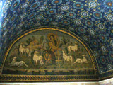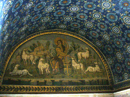Directly above the entrance, Christ is portrayed as the Good Shepherd.