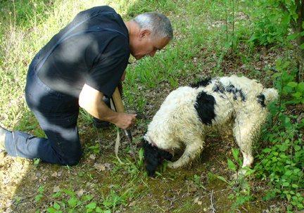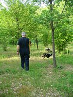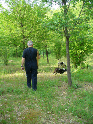 Sergio and the white dog Nappo are leading the way among the trees that Sergio had bought some ten years earlier. These trees had been inoculated with truffle spores.