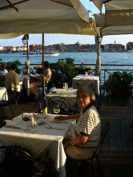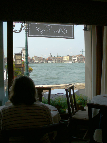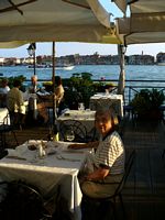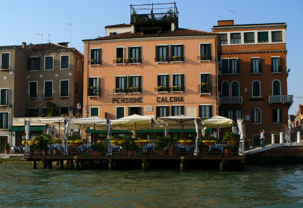 The boat went right past our hotel, the Pensione La Calcina, also known as Ruskin's House, since he had stayed there for a few months in 1877. Immediately in front of it is their restaurant, La Piscina.