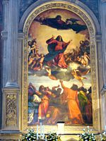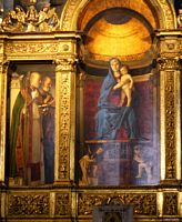 From there it was a short vaporetto ride and walk to the Frari Church which has an unusual amount of great art. From left to right below we see The Assumption of Mary by Titian, a wooden statue of John the Baptist by Donatello, and Bellini's Madonna and Child