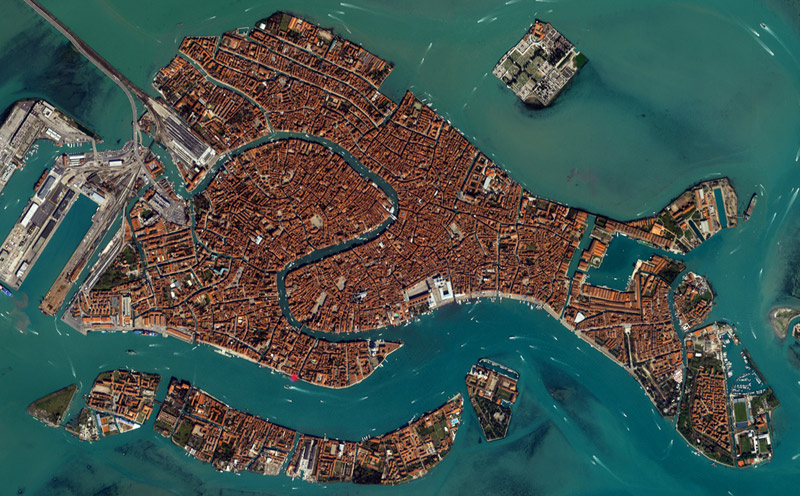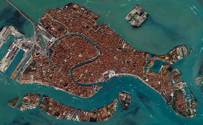 The S-curve of the main Grand Canal is clearly visible, dividing the fish-shaped city in two, with the larger Canal Giudecca and Venice's modern port facilities to its west. Our hotel was on the Canal Giudecca, where we were able to see many of the larger car ferries and cruise ships. (I have marked the hotel location with a red dot in the larger picture that you can see by clicking on the smaller picture here.)