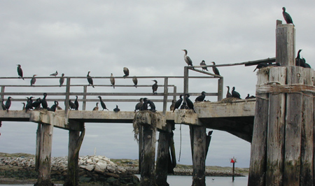 The birds in this picture are mostly cormorants and gulls. At the tops of two of the posts are some chicks.