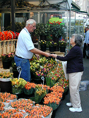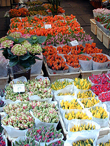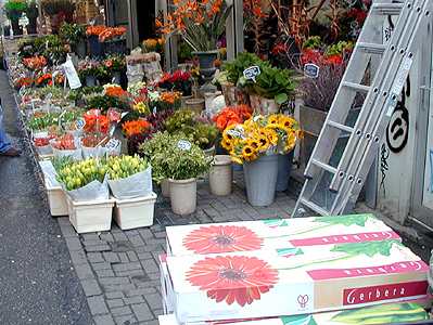 After a short rest in the hotel room we walked to the flower market. This is one of the first booths we saw, with many tulips and the boxes of gerberas from the growers.