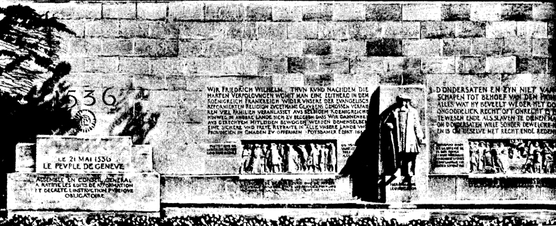 The left bas-relief is of Henry IV of France signing the Edict of Nantes in 1598 giving the Huguenots freedom in France. The statue is of Gaspard de Coligny. The bas-relief on the right is about the Swiss Reformation, showing the first chid presented for Reformed baptism. Viret is in the pulpit and Farel is seated behind him. The two large statues are of Farel and Calvin.