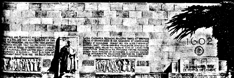 At the left, there is a monument to the Edicts of the Reformation, ratified by the people of Geneva on May 21, 1536. The first bas-relief shows Frederick, the founder of the Prussian state, welcoming the Huguenots exiled when the Edict of Nantes was repealed. The statue is of Frederick William (1620-1688.) The second bas-relief commenorates the Declaration of Independence of the United Provinces(Northern Netherlands on July 6, 1581. A statue of William the Silent (1533-1584) is to the right of the bas-relief.