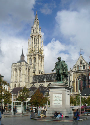 In the Groene Markt is a statue of Peter Paul Rubens with the cathedral in the background
