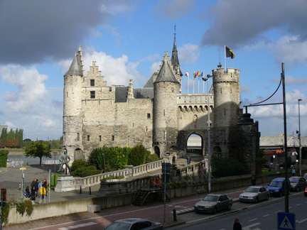 The city hall or rathaus. The Stadhuis (City Hall) dominates the Grote Markt of Antwerp. It was completed in 1565. The baroque fountain in front is the Brabo Fountain, which depicts the legend of how Antwerpen got its name. The legend is that a giant, Druon Antigoon, lived near a narrow bend in the Scheldt River and collected a toll from anyone navigating the river. Druon chopped off the hand of anyone who refused to pay. A Roman centurion named Brabo eventually killed the giant, cut off his hand, and threw it into the river. Hand werpen (hand throwing) evolved into Antwerpen.