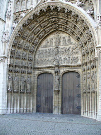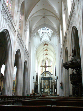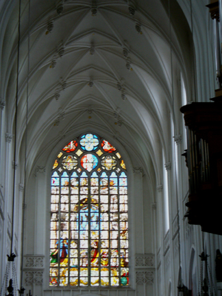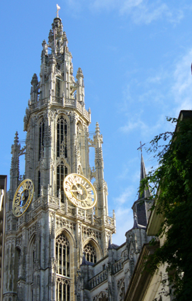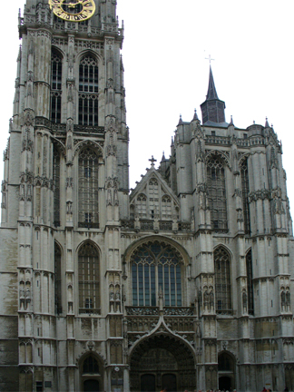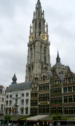 A dominating sight in Antwerp is the cathedral, Onze Lieve Vrouwen Kathedraal, or the Cathedral of Our Lady. Here are four different views. The cathedral was originally built between 1350 and 1520, ravaged by fire in 1533 and plundered by iconclasts in 1566 and 1581. The style of the cathedral is Brabant Gothic and is the largest in the Low Countries, with a spire which is 123 meters high.