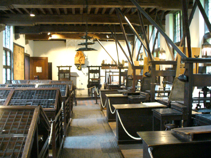 A room with type cases and a number of printing presses, some as old as 1600.