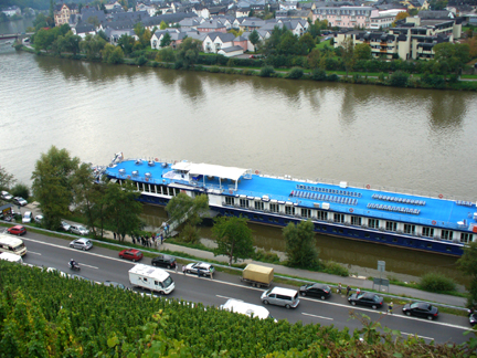 Later we walked up to the top of this vineyard and could look down on the ship.