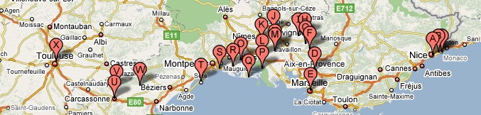 As the map above indicates, we started in Nice and ended in Carcassone. You can either pick areas you would like to see from the drop-down menu at the top of each page or you can follow our itinerary by following the link at the bottom of each page to the next site.