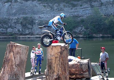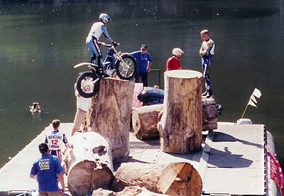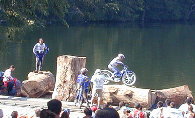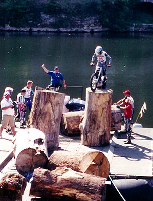Here a cyclist is balancing on one log preparing to jump to the next one. He had started on the horizontal log on the left, then up to the top of the vertical log and is now on another horizontal log, balancing before jumping to the next one. He then had to turn around, again without losing balance, and make the trip in reverse order.