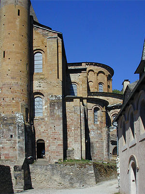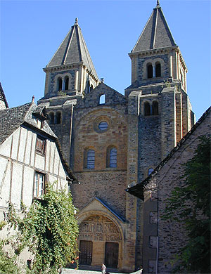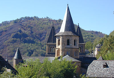 After a fairly long bus ride from Le Puy we arrived at the village of Conques, clustered around the Abbaye de Ste-Foy. Sainte Foy was a young girl who became an early Christian martyr. Her relics were were first kept in a rival monastery. In the 9th century a monk from Conques stole the relics, thereby attracting pilgrims to this remote spot and establishing Conques as a stop on the pilgrimage route from Le Puy to Santiago de Compostela.