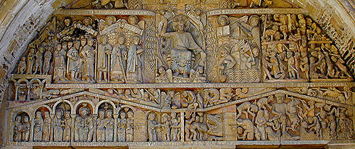 The tympanum, sculpted in 1135, depicts the Last Judgment, with the Devil in Hell on the lower right and Christ in Heaven in the central postion.