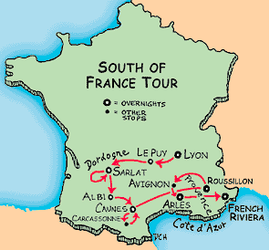 As the map above indicates, we started in Lyon and ended in Nice. You can either pick areas you would like to see from the drop-down menu at the top of each page or you can follow our itinerary by following the bus at the bottom of each page to the next site.