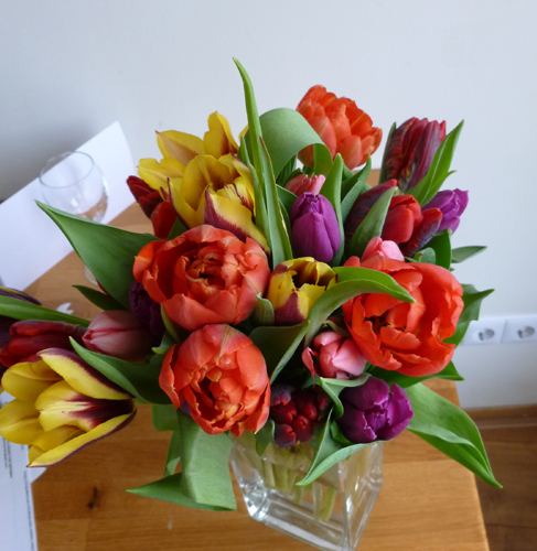 She bought a large bunch of tulips for our apartment.