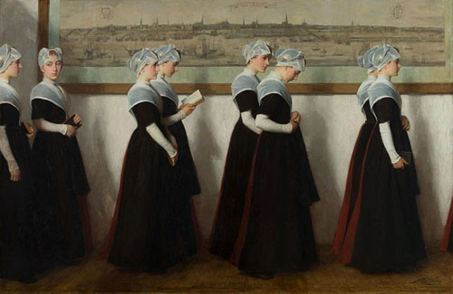 For four hundred years, the building complex which now houses the Amsterdam Museum was the Civil Orphanage. That memory is recalled with the display of this painting of orphans going to church.
