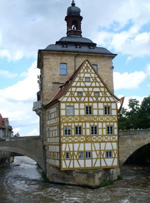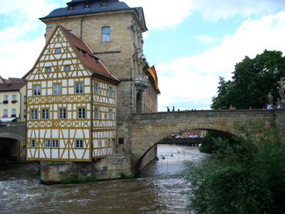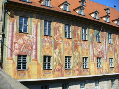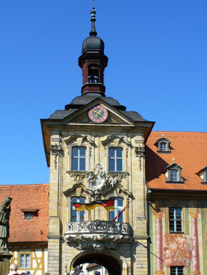 We saw the old town hall, built in 1744-56 on a bridge across the Regnitz River. This shows the "power struggle" which existed between the Church and the secular authorities. The local citizens controlled the town on one side of the river and the prince-bishops the other. Neither side was willing to give up any of its territory for the town hall to be built and eventually the problem was resolved by building it in "no-man's land" on the bridge.