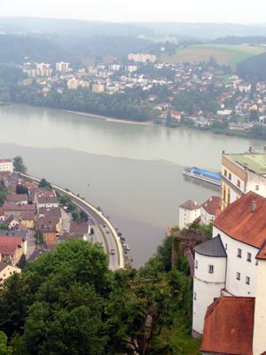 The city of Passau lies at the confluence of the Danube, Inn and Ils rivers. The Ils is the small river coming in from the top, the Danube is in the center and the Inn comes in at the bottom of this map. Note the differences in color at the confluence.