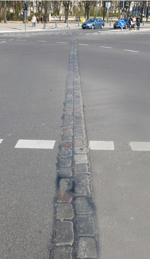 Throughout the city, a row of bricks shows the position of the former Berlin wall. This was a barrier constructed by the German Democratic Republic (GDR, East Germany) starting on 13 August 1961, that completely cut off West Berlin from surrounding East Germany and from East Berlin.