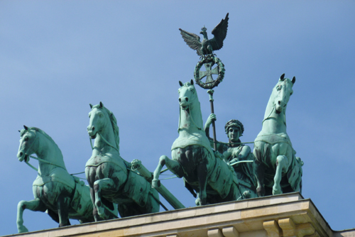 The Berlin Quadriga at the top of the gate was designed in 1793 as the Quadriga of Victory, as a symbol of peace (represented by the olive wreath carried by Victory). Located atop the Brandenburg Gate in Berlin, Germany, it was seized by Napoleon during his occupation of Berlin in 1806, and taken to Paris. It was returned to Berlin in 1814. Her olive wreath was subsequently replaced by an Iron Cross. The statue suffered severe damage during the Second World War, and the association of the Iron Cross with Prussian militarism convinced the Communist government of East Germany to remove this aspect of the statue after the war. The iron cross was restored after German reunification in 1990.