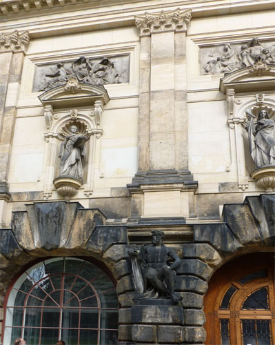 The entrance to the historic Green Vault in the Royal Palace. The Green Vault is a unique historic museum that contains the largest collection of treasures in Europe. Founded by Augustus the Strong in 1723, it features a rich variety of exhibits from the Baroque to Classicism. It is named after the formerly malachite green painted column bases and capitals of the initial rooms. After the destruction of the Second World War, the Green Vault has been completely reconstructed. Today, its treasures are shown in two exhibitions: The Historic Green Vault is famous for its splendors of the historic treasure chamber as it existed in 1733.