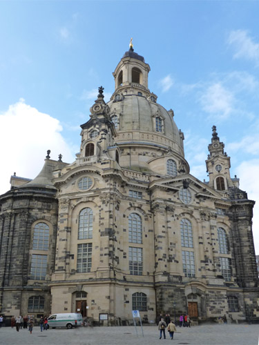 This is the restored Frauenkirche, an outstanding example of the renovation of Dresden. As the older stones are covered with a darker patina, due to fire damage and weathering, the difference between old and new stones will be clearly visible for a number of years after reconstruction. Notice that the darker parts at the left and right are those which best survived the bombing.