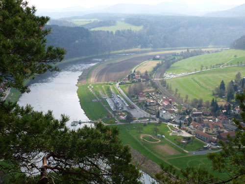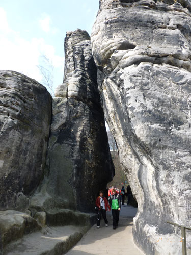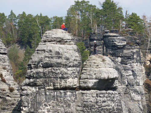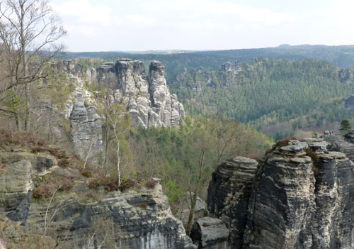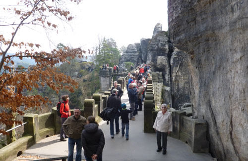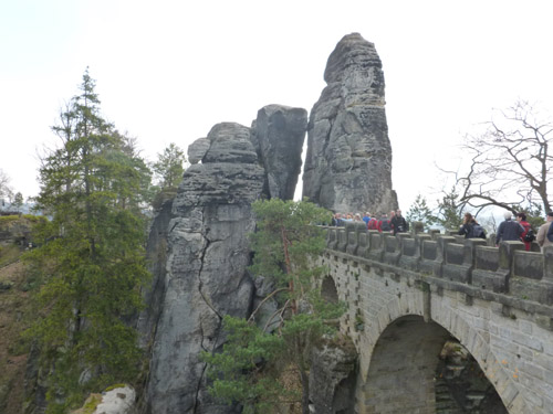 We were taken by bus to the Bastei, a spectacular rock formation towering 194 metres (636 feet) above the Elbe River in the Elbe Sandstone Mountains of Germany. This was our first view as we walked from the bus. ![]() A view as we got closer to the viewpoint. ![]() Here we see the viewpoint on the right and the Elbe below. ![]() A view of the Elbe from the viewpoint. ![]() The Elbe in the other direction. ![]() A Wikipedia photo of the famous Bastei bridge, made of sandstone in 1851. ![]() We would soon be walking on this bridge. ![]() Two more views of the bridge. ![]() ![]() A view from the bridge. In the upper left you can barely see the red figure of a climber. ![]() A telephoto shot of two climbers. There are some 14,000 climbing routes on over 1,100 rock pinnacles. At the beginning of the 20th century, the Saxon Rules for rock climbing were established. They are considered to be one of the origins of free climbing. Ropes and bolts may only be used for safety but never as a means of climbing. The use of chalk and common means of protection such as nuts and friends is also not permitted; instead knotted nylon slings are used. With a few exceptions, climbing is only practiced and permitted at freestanding rock towers. ![]() Near the overlook was a sign with a photo of Adrian Zingg's drawing of the overlook. ![]() One more look at this spectacular view. Next we ride a bus to Prague. |