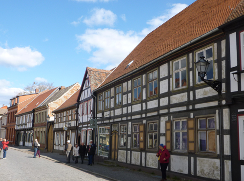 Half-timbered buildings in the town. The shops are closed because it is Sunday.