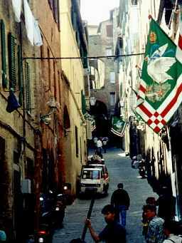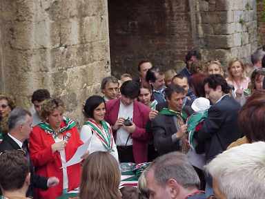 The Sienese are not only citizens of Siena, but are even more closely tied to their contrade or parish. On our walk into the city the previous evening we had seen a number of people from the contrade named "Goose" practice their flag twirling for an upcoming event. On this day we walked through that contrade again and every building had the flag of that contrade and there were many men building stands for a celebration to be held that evening. Some of the group went to that celebration, a baptism of children into that contrade. In Siena children are baptised both in the church and in their contrade.