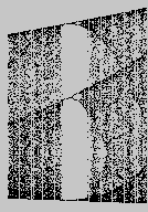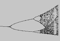 Since r = 2 at the left end and r = 3.9 at the right end it is clear where the areas of 2 cycles, 4 cycles, and even 8 cycles appear. To account for the 3 cycle at 3.83 we show an expanded graph beween r = 3.825 and r = 3.86 for the small "window" in the chaos around it.