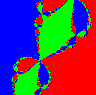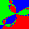 x basin _____________________ -0.78240 green -0.78242 red -0.78244 blue -0.78245 green -0.78246 blue -0.78248 red -0.78250 blueIt is even more interesting to note that between the first two points above is the point x = -0.782413 which lies in the blue basin, between the second and the third points is x = -0.7824333 which lies in the green basin, and between the third and the fourth points we find -0.7824495 which lies in the red basin! Certainly this is a very sensitive area of the graph.
